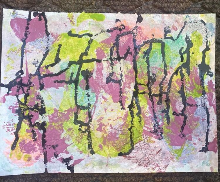 ….The black figures stand as bold silhouettes against a kaleidoscopic backdrop of vibrant hues. Their striking forms demand attention, creating a visual focal point that anchors the composition. The contrast between the dancing dark figures and the lively multicolored canvas evokes a sense of harmony. In this piece the black figures appear to be in various states of dance their bodies contorted in expressive shapes that exude energy and freedom
